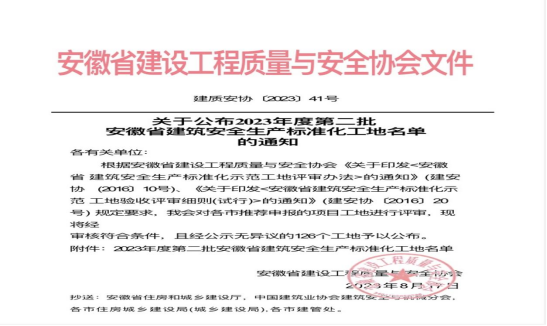 8月17日,安徽省建設工程質量與安全協會發布2023年度第二批安徽省建筑安全生產標準化工地名單,黃山建工集團仙人洞南路東側D1地塊(文瀾軒)項目獲評“安徽省建筑安全生產標準化工地”。
