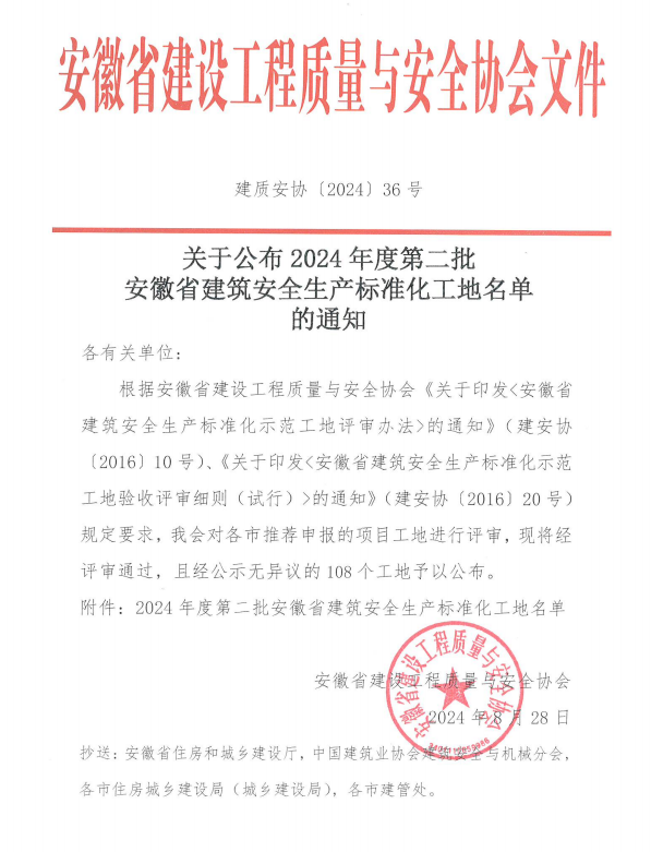近日,安徽省建設工程質量與安全協會公布2024年度第二批安徽省建筑安全生產標準化工地名單,由黃山建工集團承建的國網安徽黃山供電公司運維檢修及信息通信用房項目光榮上榜。