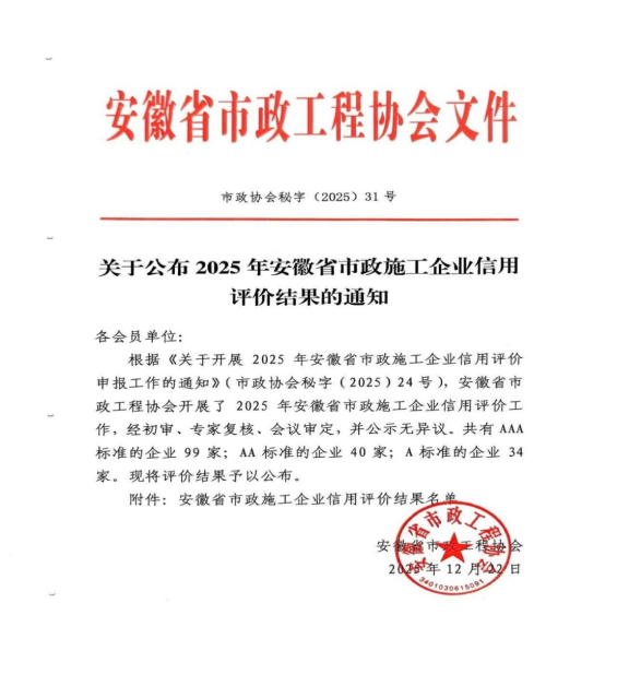 近日,安徽省市政工程協會正式發布《關于公布2025年安徽省市政施工企業信用評價結果的通知》。黃山市建工集團憑借卓越的綜合實力、規范的市場行為、優良的工程品質及堅實的信用體系建設,成功獲評最高信用等級——AAA級。標志著集團在誠信經營、履約能力與社會責任履行方面獲得了行業主管部門與協會的高度認可,是企業信用建設領域的又一重要里程碑。